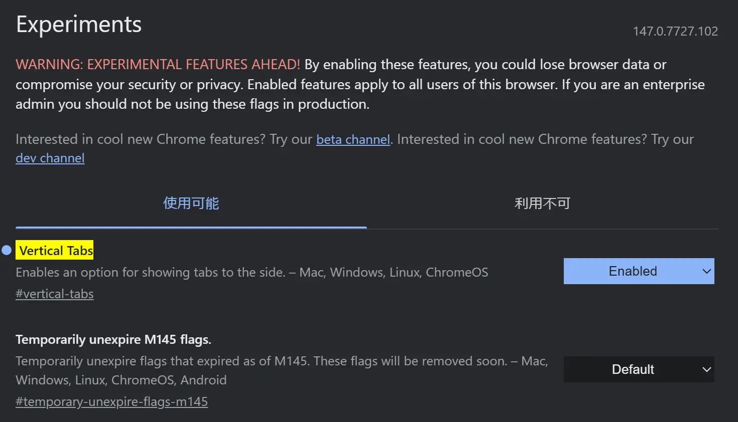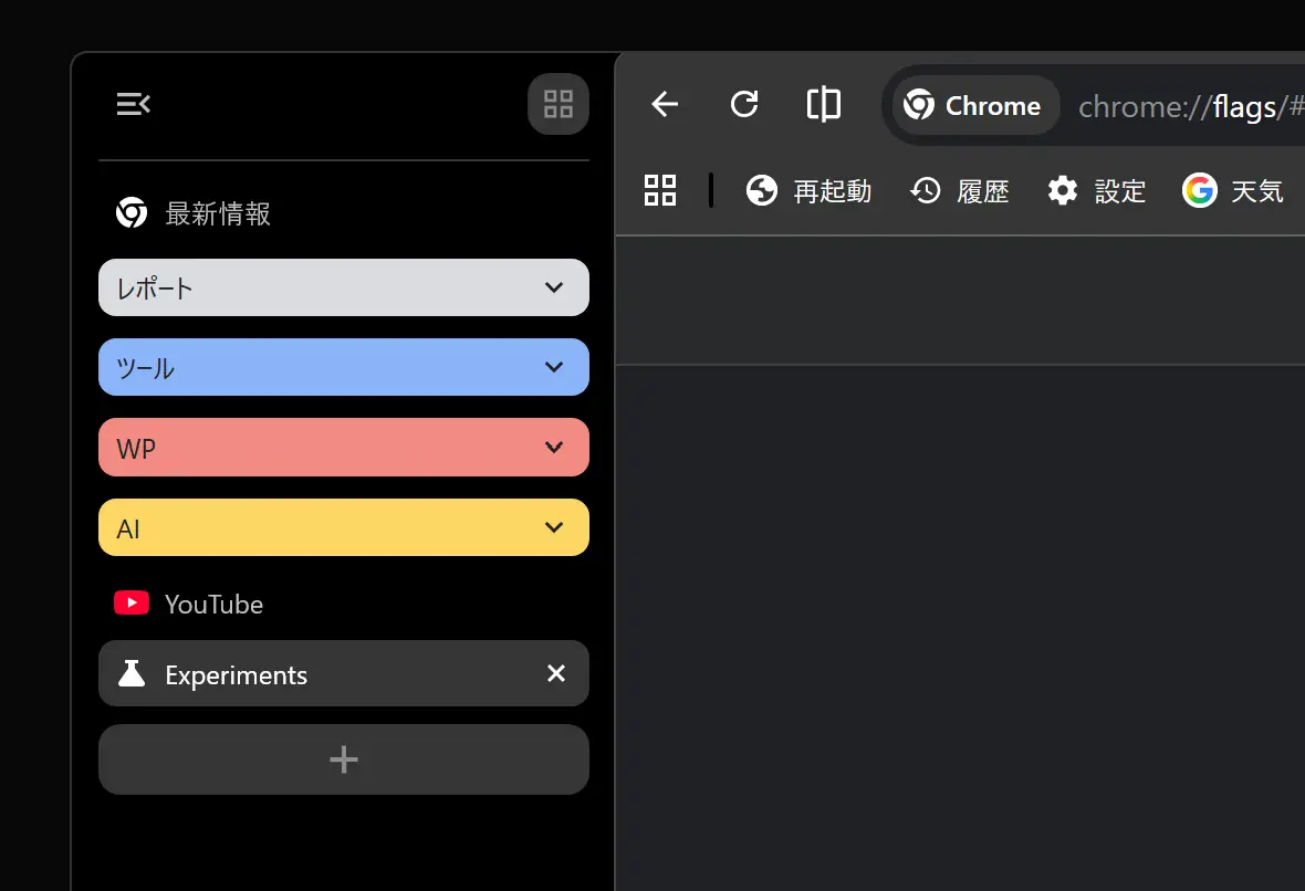 2026年4月時点では、垂直タブはデフォルトで有効な状態ではなく試験的な機能となっています。