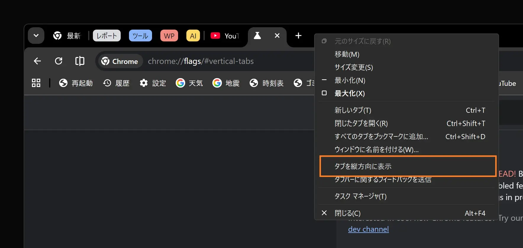 vertical-tabsを有効化(または垂直タブの本実装後)したら、タブ付近で右クリックしてタブメニューを表示し、「タブを縦方向に表示」を選択します。